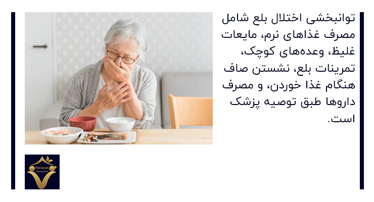 اختلال بلع در سالمندان به دلیل تضعیف عضلات، اعصاب و همچنین بیماریهای مختلف ایجاد میشود. اگر این عوارض و اختلالات برطرف نشوند؛ عواقب ناگواری برای سالمند به باور خواهند آورند. از این رو، میبایست تمامی اطلاعات لازم به سالمند و مراقبین او داده شود. فرد مسن دچار اختلال بلع باید تحت نظارت و مراقب متخصص فعالیتهای خود را ادامه دهد.