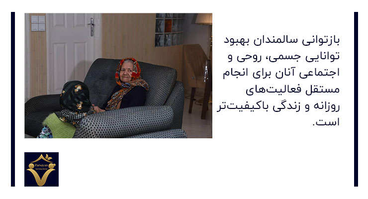 - افراد سالمندی که دچار ناتوانی و بیماری هستند تحت حمایت توانبخشی قرار میگیرند و مجدداً تواناییهای خود را به دست میآورند.